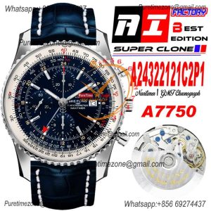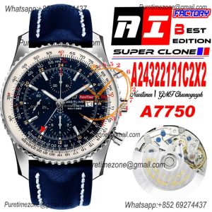 A24322121 Navitimer 1 World GMT A7750 Automatic Chronograph Mens Watch Blue Dial Leather Strap Best Edition