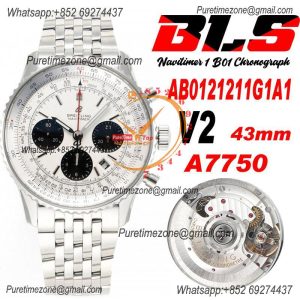 AB0121211B1X1 Navitimer A7750 Automatic Chronograph Mens Watch 43mm White Dial SS Bracelet Best Edition V2