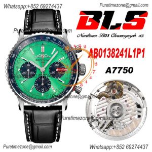 Navitimer B01 AB0138241 A7750 Automatic Chronograph Mens Watch Best Edition BLSF Green Dial Black Leather Strap