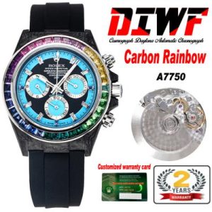 Daytona A7750 Automatic Chronograph Ladies Watch Best Editon DIWF Carbon Rainbow Diamond Blue Dial White Rubber