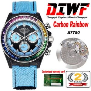 Daytona A7750 Automatic Chronograph Ladies Watch Best Editon DIWF Carbon Rainbow Diamond Black Dial Blue Nylon