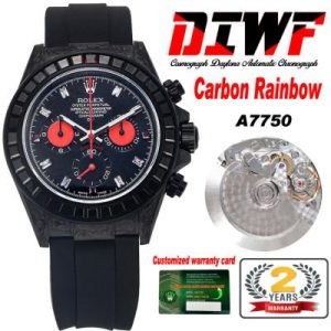 Daytona A7750 Automatic Chronograph Ladies Watch Best Editon DIWF Carbon Rainbow Diamond Bezel Black Dial Rubber Strap