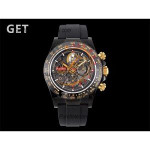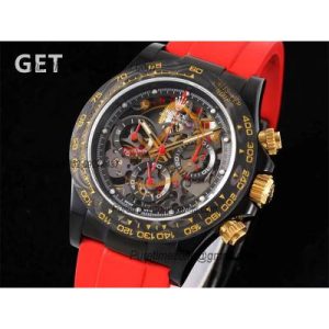 Daytona Blaken SA4130 Automatic Chronograph Mens Watch Best Edition GETF Carbon Bezel Skeleton Gold Dial Red Rubber