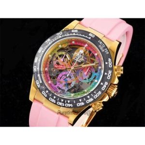 Daytona Blaken SA4130 Automatic Chronograph Mens Watch Best Edition GETF Carbon Bezel Skeleton Gold Dial Pink Rubber