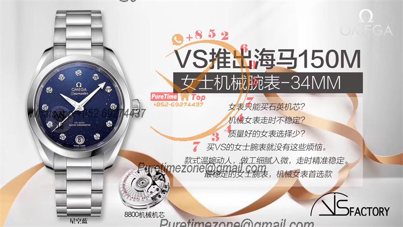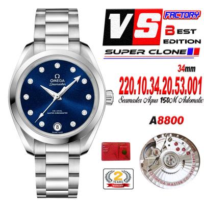 Home OMG Aqua Terra 150M 34mm A8800 Autoamtic Womens Watches VSF Best Ediiton Blue Dial SS Bracelet Ladies