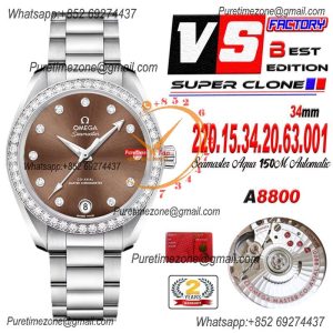 Aqua Terra 150M 34mm A8800 Autoamtic Womens Watches VSF Best Ediiton Diamonds Bezel Brown Dial SS Bracelet Ladies $600.00 $400.00