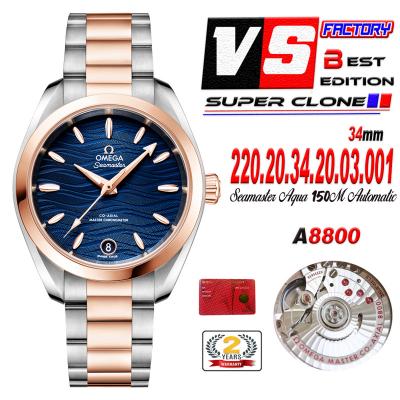 Home OMG Aqua Terra 150M 34mm A8800 Autoamtic Womens Watches VSF Best Ediiton RG Blue Dial SS Bracelet Ladies