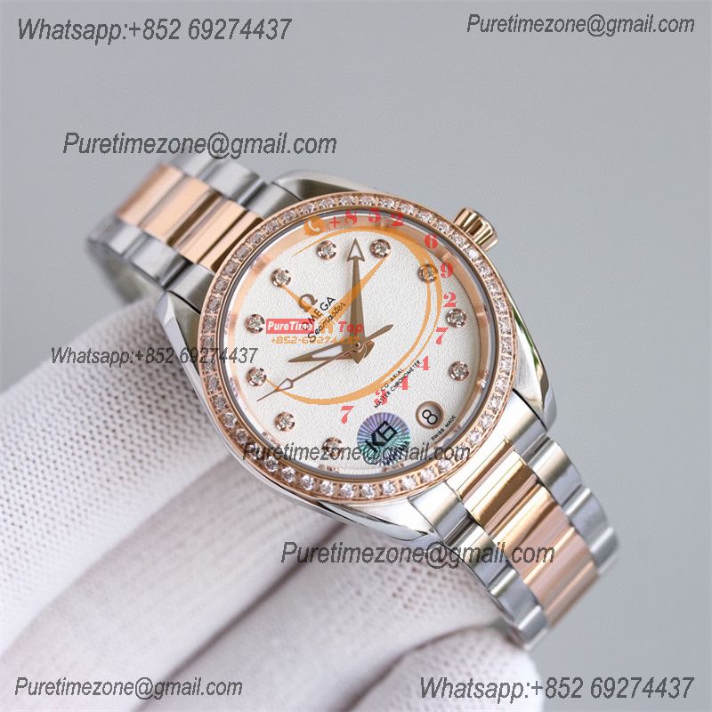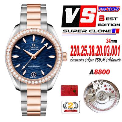 Home OMG Aqua Terra 150M 34mm A8800 Autoamtic Womens Watches VSF Best Ediiton RG Diamonds Bezel Blue Dial SS Bracelet Ladies