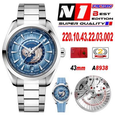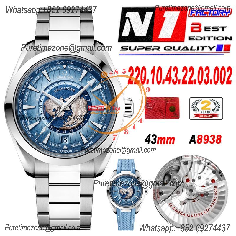 Home OMG Aqua Terra 150M Worldtimer A8938 Automatic Mens Watch Best Edition N1F V2 43mm Blue Dial on SS Bracelet CHS