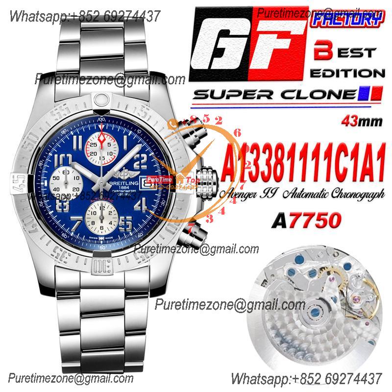Avenger II 43 A13381111C1A1 A7750 Automatic Chronograph Mens Watch Best Edition GF Blue Dial SS Bracelet CHS