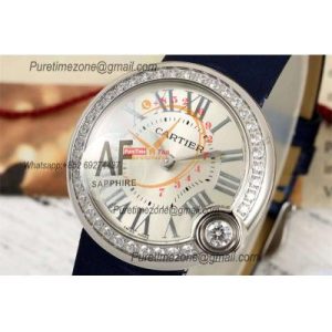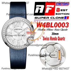 Ballon Blanc W4BL0003 30mm Ronda Quartz Womens Watch Best Edition AF Silver Dial Diamonds Bezel Blue Fabric Strap