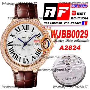Ballon Bleu WJBB0029 42mm A2824 Automatic Mens Watch Best Edition AF RG Diamond Bezel Silver Dial Brown Leather Strap