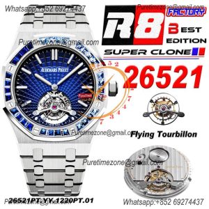 Royal Oak 26521 Extra Thin Hand Winding Tourbillon Mens Watch Best Edition R8F Diamonds Bezel Blue Dial SS Bracele