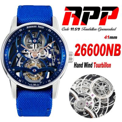 Code 11.59 26600 Tourbillon Automatic Mens Watch APPF Best Edition Black Skeleton Dial Blue Leather Strap CHS