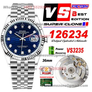 Be the first to review “Datejust 126234 Automatic Mens Watch Super Clone VSF 36 Blue Dial 904L Steel Jubilee Bracelet CHS VS3235” Cancel reply