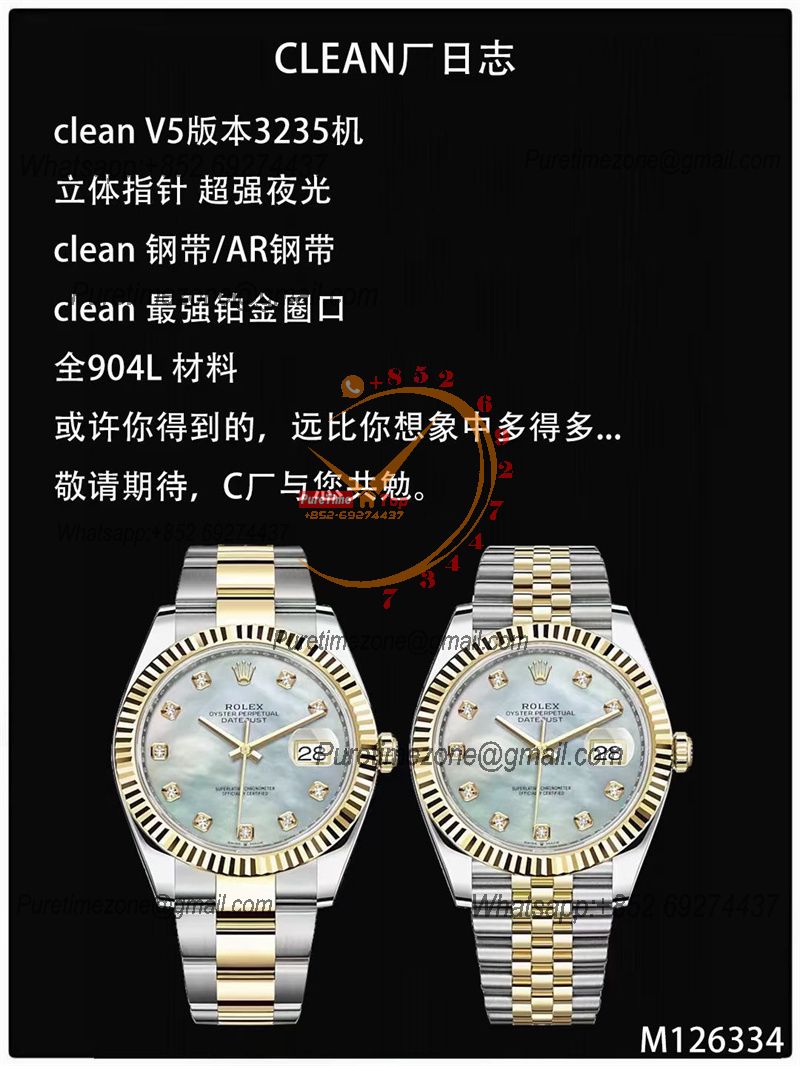 EWF Datejust 41 126331 A3235 Automatic Mens Watch Tow Tone YG MOP Diamonds Dial SS Jubilee Bracelet Best Edition