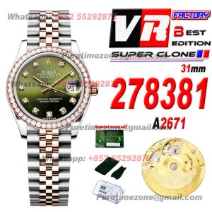 Datejust 278381 SS/RG Automatic Womens Watch Super Clone VRF 31 Diamond Bezel Green Dial Jubilee Bracelet Ladies A2671 $600.00 $490.00