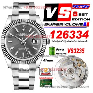 Datejust 126334 Automatic Mens Watch Super Clone VSF 41 Gray Dial 904L Steel Jubilee Bracelet CHS VS3235