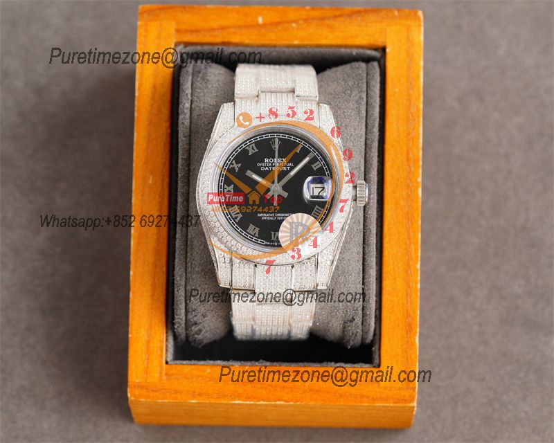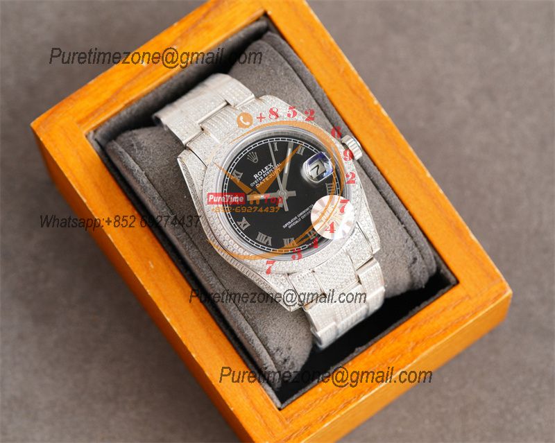 Home Rolex Iced Out Datejust A2824 Automatic Mens Watch 41 Best Edition RRF Black Roman Paved Diamonds Fully Iced Out 904L Steel Bracelet