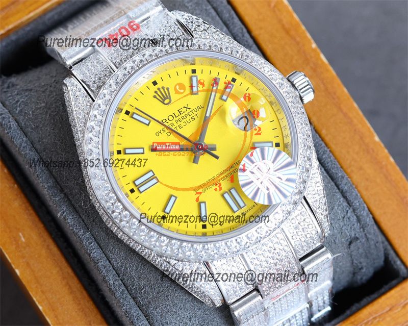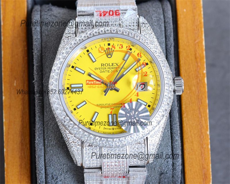 Datejust A2824 Automatic Mens Watch 41 Best Edition RRF Yellow Stick Diamonds Fully Iced Out 904L Steel Bracelet