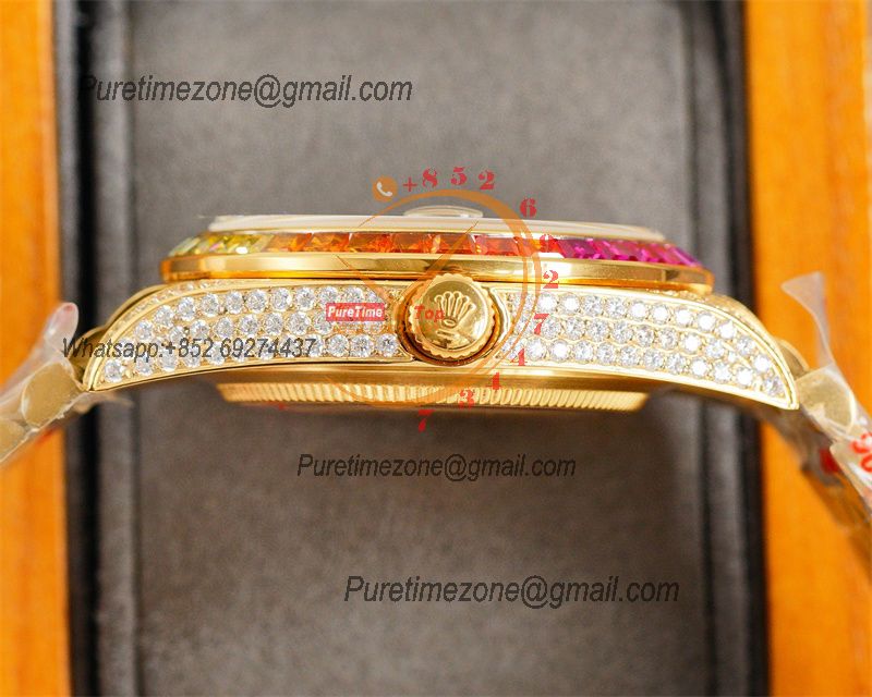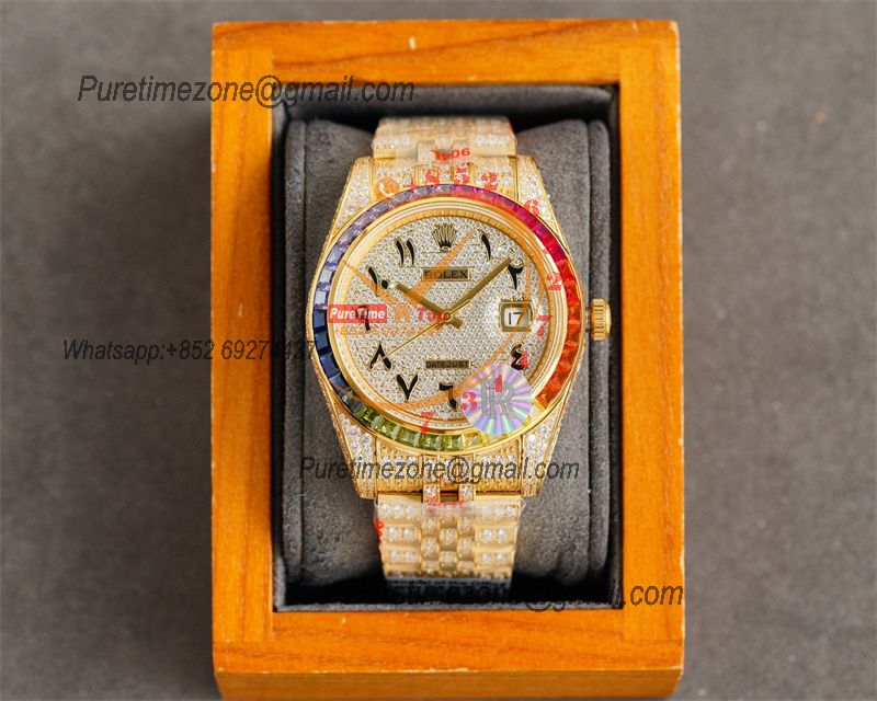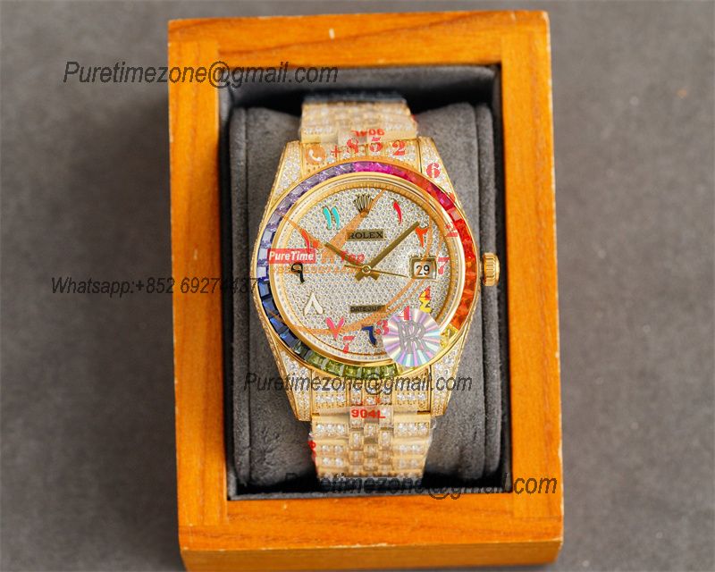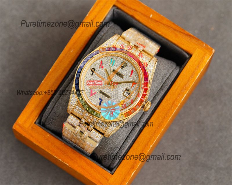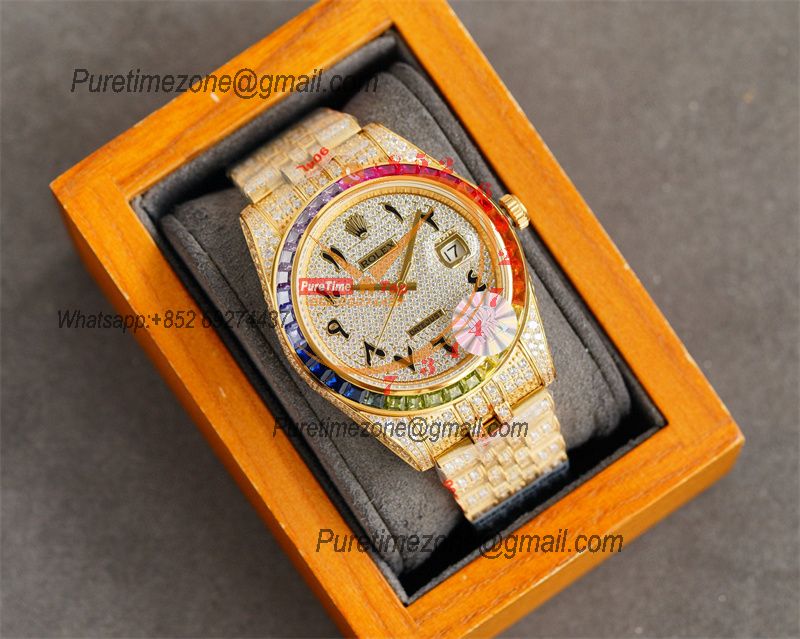 Home Rolex Iced Out Datejust A2824 Automatic Mens Watch Best Edition RRF 41 YG Rainbow Diamonds Bezel Colors Arabic Dial 904L Steel Bracelet