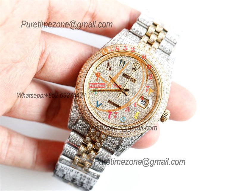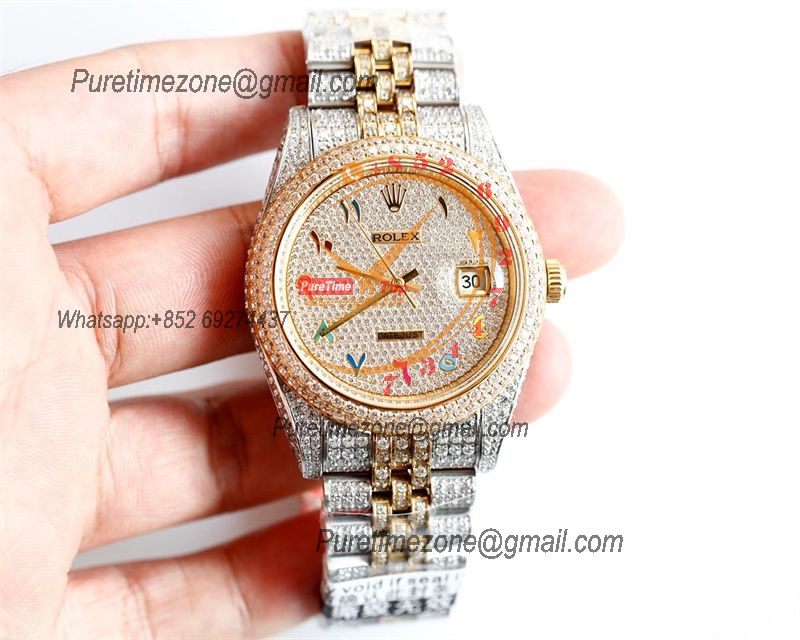 Home Rolex Iced Out Datejust A3235 Automatic Mens Watch Best Edition TWF TTYG Paved Diaomond Color Arabic Dial Ice Out 904L Steel Bracelet
