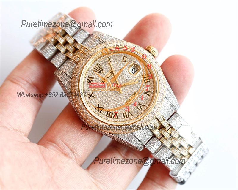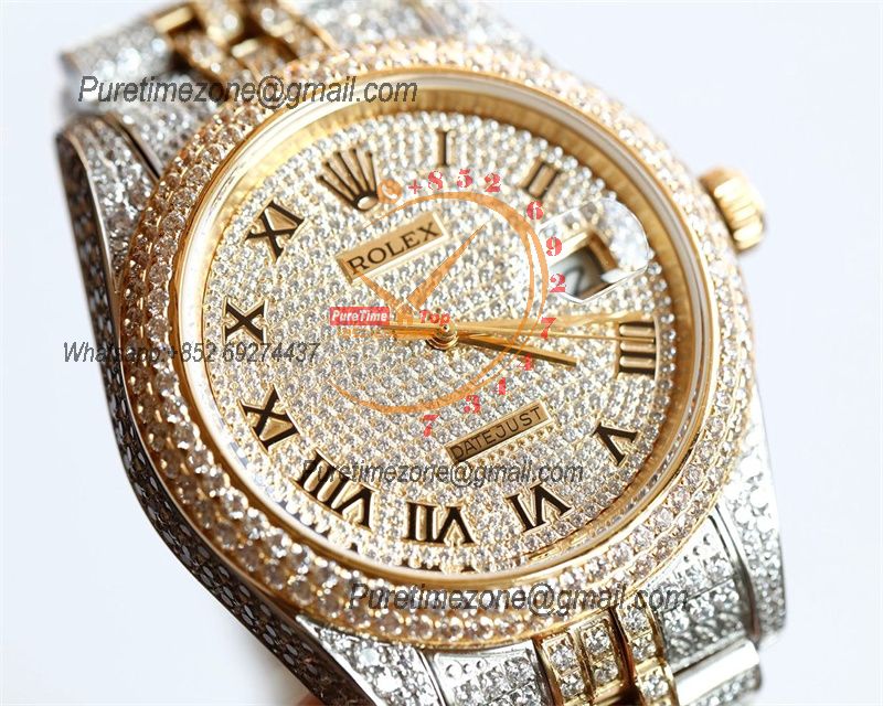 Home Rolex Iced Out Datejust A3235 Automatic Mens Watch Best Edition TWF TTYG Paved Diaomond Gold Roman Dial Ice Out 904L Steel Bracelet
