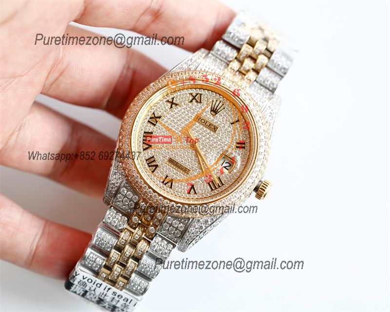 Datejust A3235 Automatic Mens Watch Best Edition TWF TTYG Paved Diaomond Gold Roman Dial Ice Out 904L Steel Bracelet