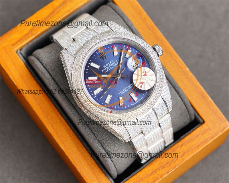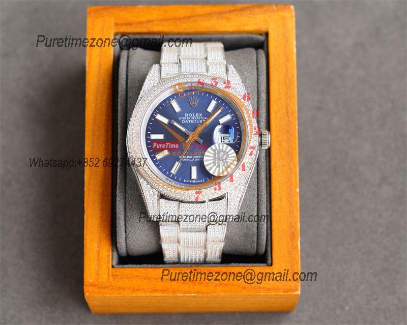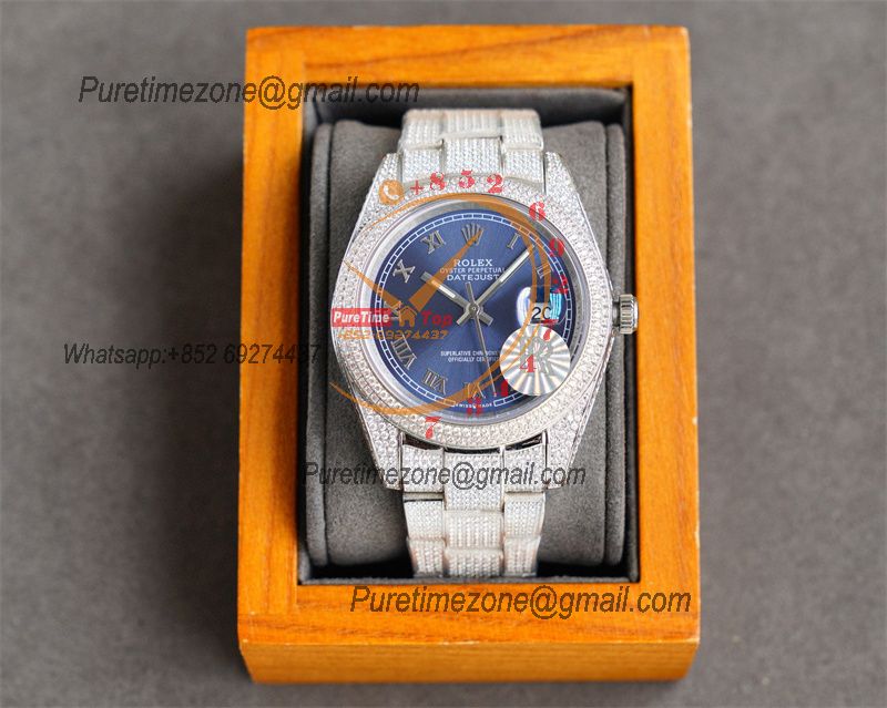 Datejust A2824 Automatic Mens Watch 41 Best Edition RRF Blue Roman Paved Diamonds Fully Iced Out 904L Steel Bracelet