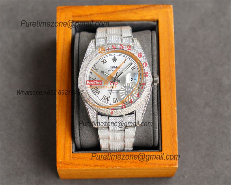 Datejust A2824 Automatic Mens Watch 41 Best Edition RRF Silver Roman Paved Diamonds Fully Iced Out 904L Steel Bracelet