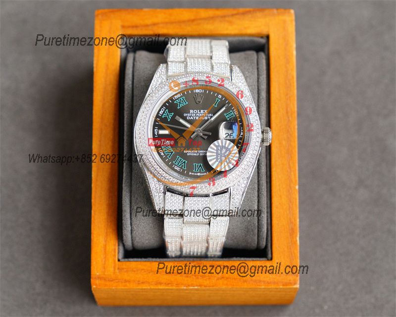 Home Rolex Iced Out Datejust Miyota Automatic Mens Watch 41 Best Edition RRF Wimbledon Green Roman Paved Diamond 904L Steel Bracelet
