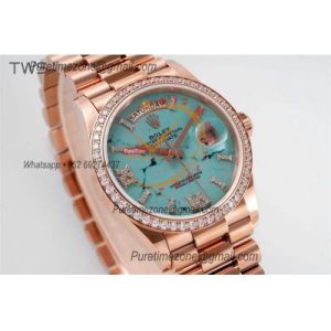 DayDate 36 128345 A2836 Automatic Womens Watch Best Edition TWSF RG Diamonds Bezel Turquoise Dial President Bracelet CHS