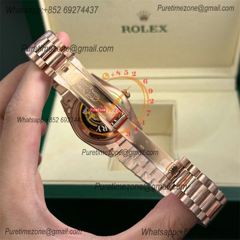 Strap:18K rose gold plated solid 904L stainless steel bracelet, Cu-W metal to increase watch weight to match the genuine gold watch weight
