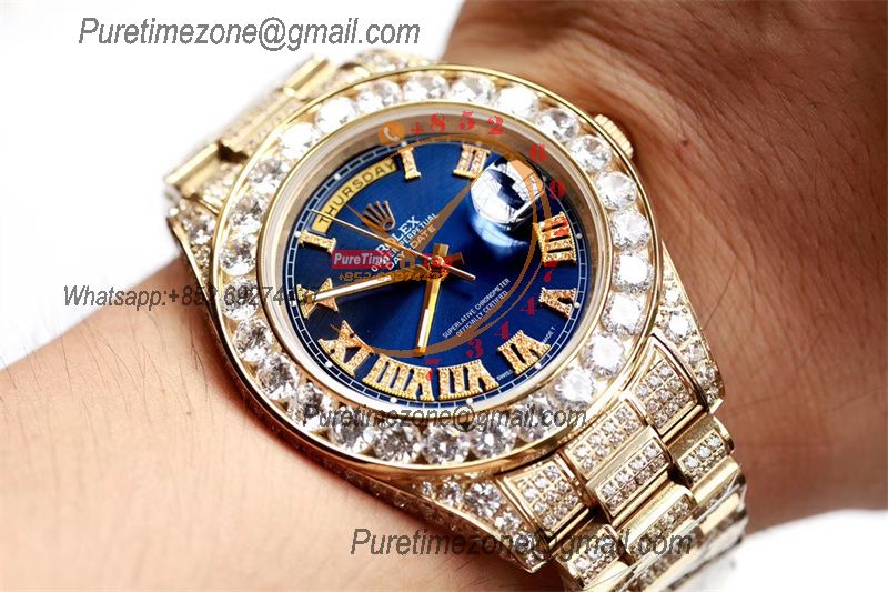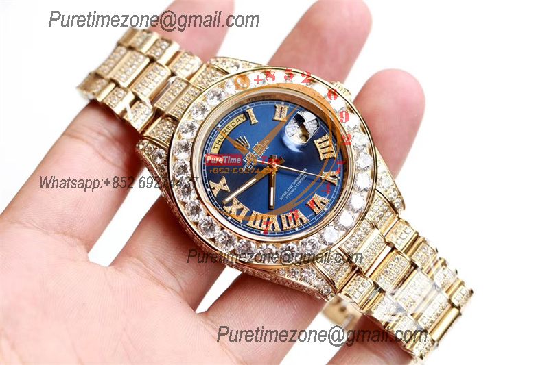 Home Rolex Iced Out Daydate A21J Automatic Mens Watch Best Edition TWF YG Paved Diaomond Blue Roman Dial Ice Out 904L Steel Bracelet
