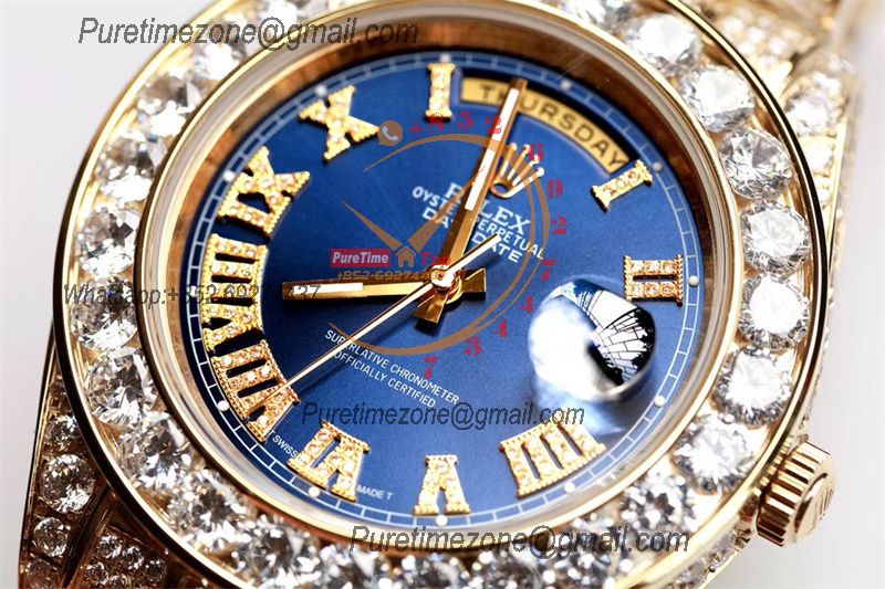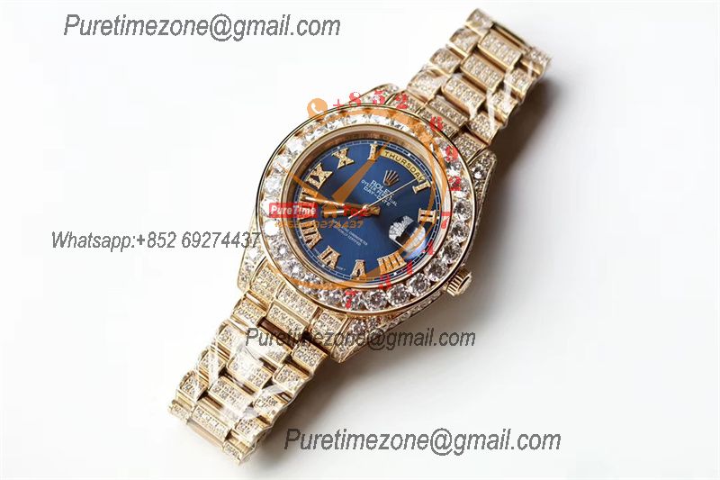 Daydate A21J Automatic Mens Watch Best Edition TWF YG Paved Diaomond Blue Roman Dial Ice Out 904L Steel Bracelet