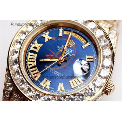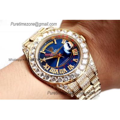 Daydate A21J Automatic Mens Watch Best Edition TWF YG Paved Diaomond Blue Roman Dial Ice Out 904L Steel Bracelet