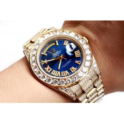 Home Rolex Iced Out Daydate A21J Automatic Mens Watch Best Edition TWF YG Paved Diaomond Blue Roman Dial Ice Out 904L Steel Bracelet