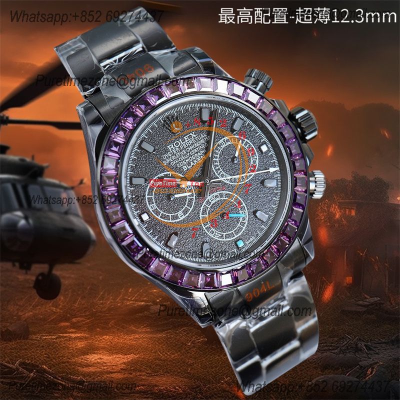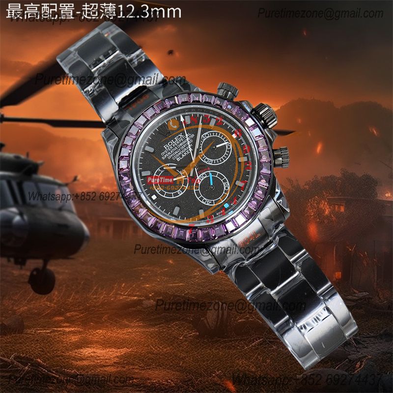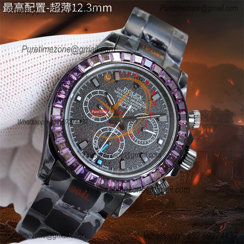 Daytona Blaken A7750 Automatic Chrono Mens Watch Best Edition BLAKENF Purple Diamond Bezel PVD Steel All Black Dial CHS