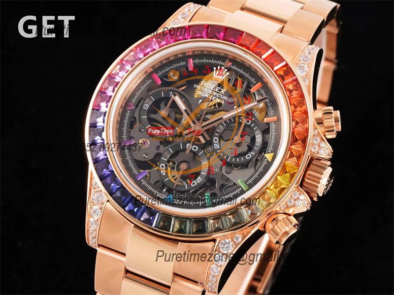 Daytona Blaken SA4130 Automatic Chrono Mens Watch Best Edition GETF RG Rainbow Diamond Skeleton Dial 904L SS Bracelet