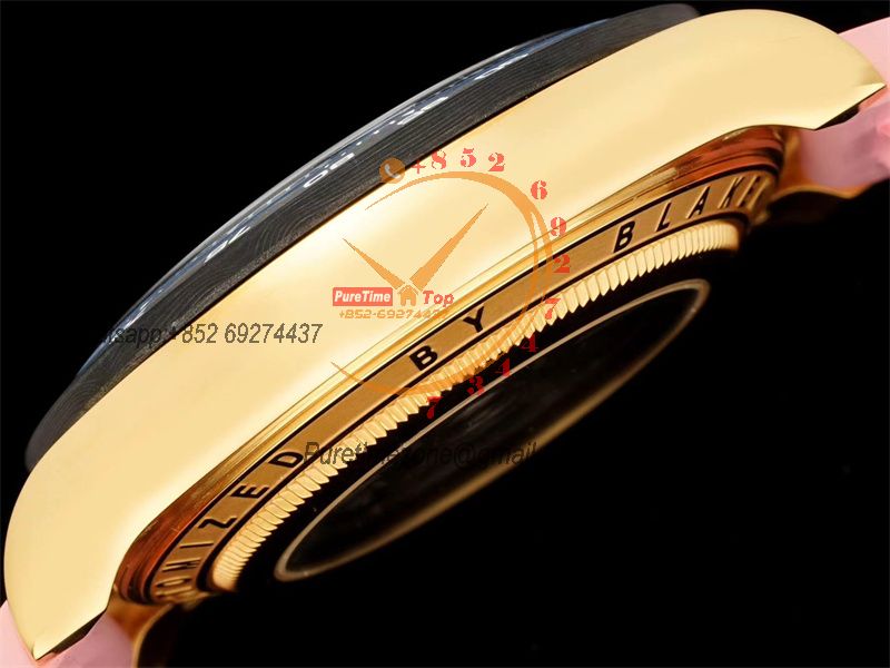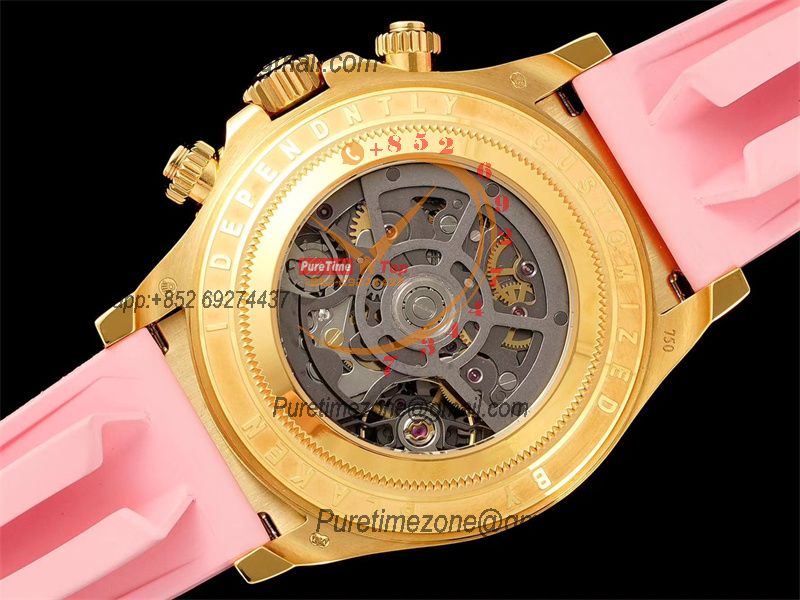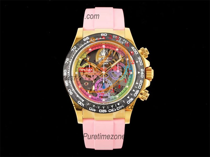 Daytona Blaken SA4130 Automatic Chronograph Mens Watch Best Edition GETF Carbon Bezel Skeleton Gold Dial Pink Rubber