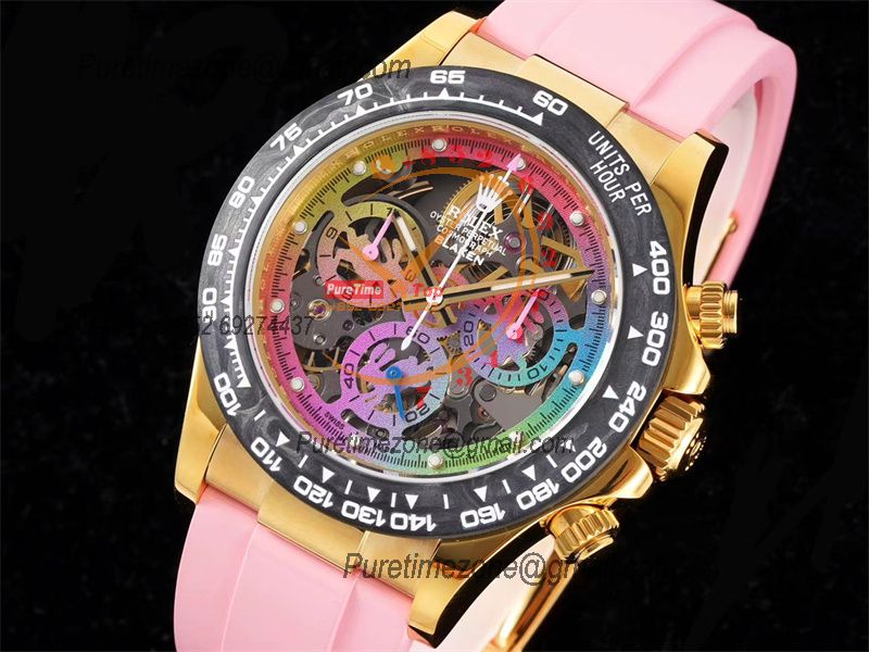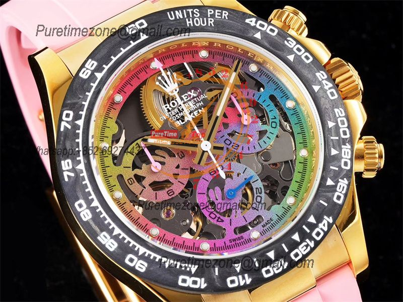 Home Rolex Daytona Cosmograph Daytona Blaken SA4130 Automatic Chronograph Mens Watch Best Edition GETF Carbon Bezel Skeleton Gold Dial Pink Rubber