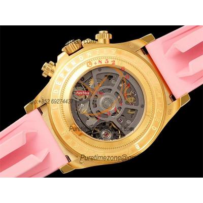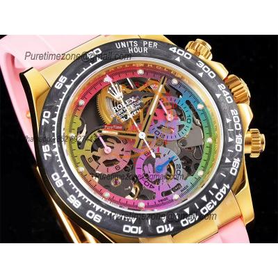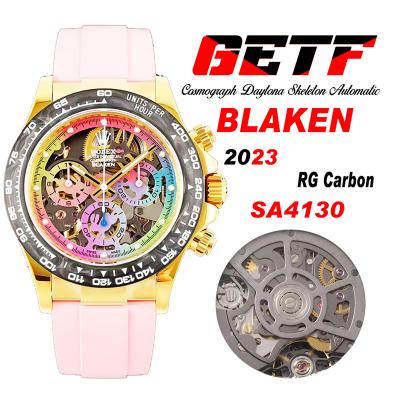 Daytona Blaken SA4130 Automatic Chronograph Mens Watch Best Edition GETF Carbon Bezel Skeleton Gold Dial Pink Rubber