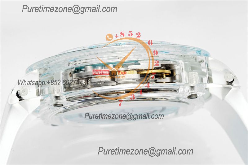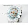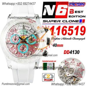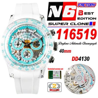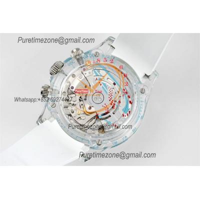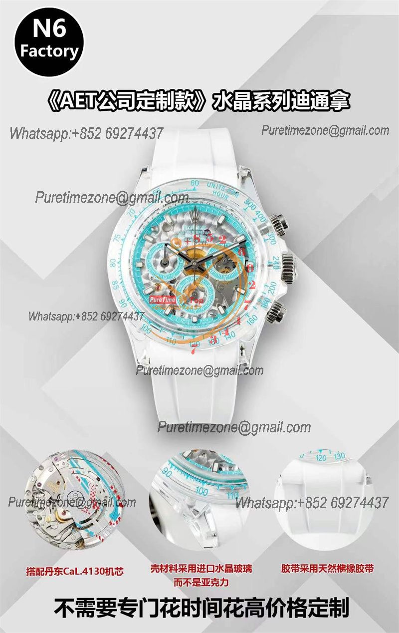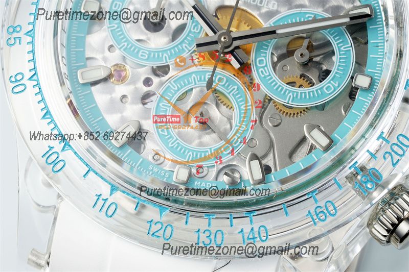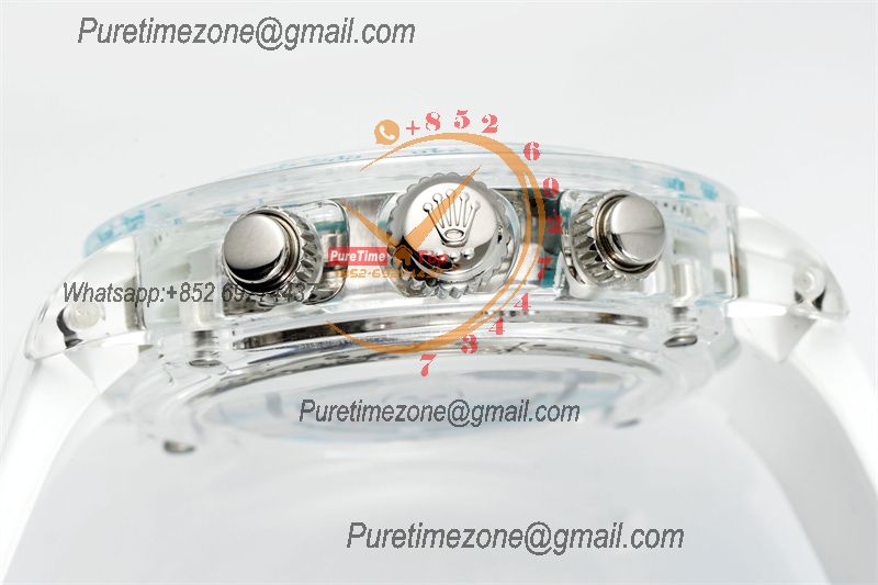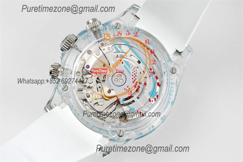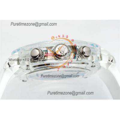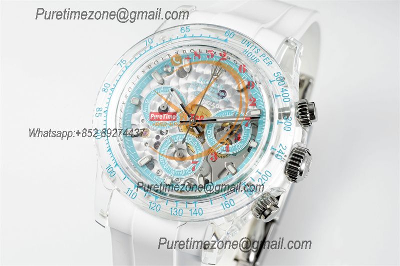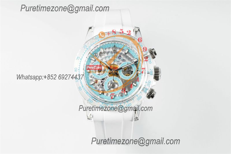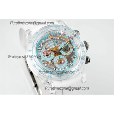 Daytona Transparent SA4130 Automatic Chronograph Mens Watch Best Edition N6F Transparent/Blue Dial White Rubber Strap CH