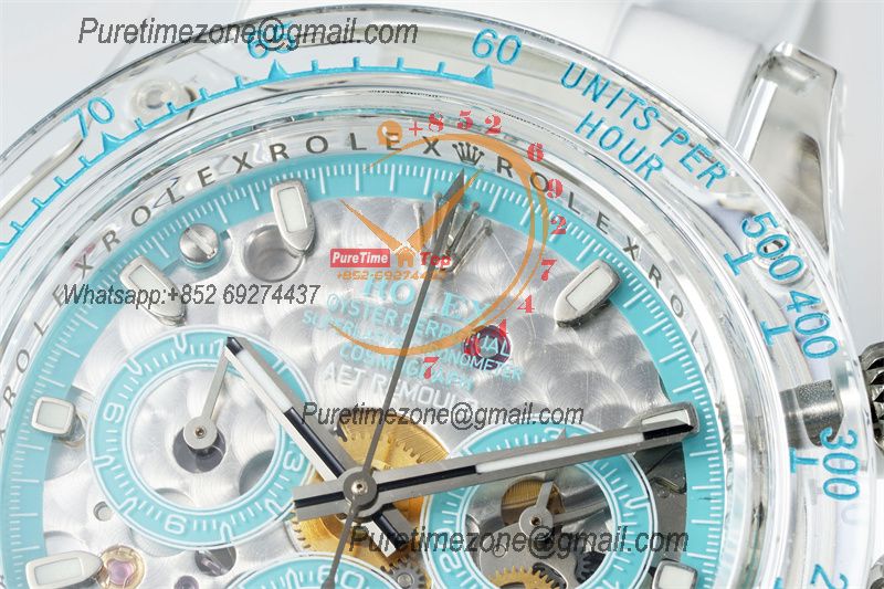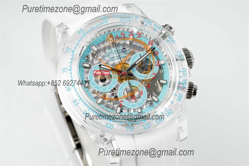 Home Rolex Daytona Cosmograph Daytona Transparent SA4130 Automatic Chronograph Mens Watch Best Edition N6F Transparent/Blue Dial White Rubber Strap CH