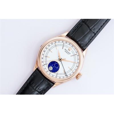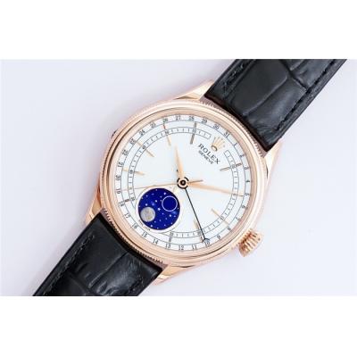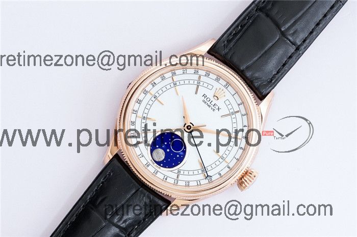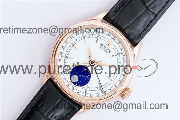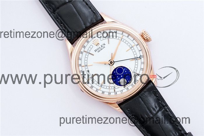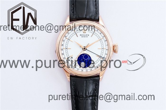Home Rolex Cellini EWF Cellini Date 50535 Moon Phase A3195 Automatic Mens Watch 39mm RG White Dial Black Leather Strap Best Edition