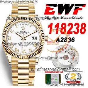 EWF DayDate 36 128238 A2836 Automatic Mens Watch YG Fluted Bezel Silver Roman Dial President Bracelet Best Edition $552.00 $460.00
