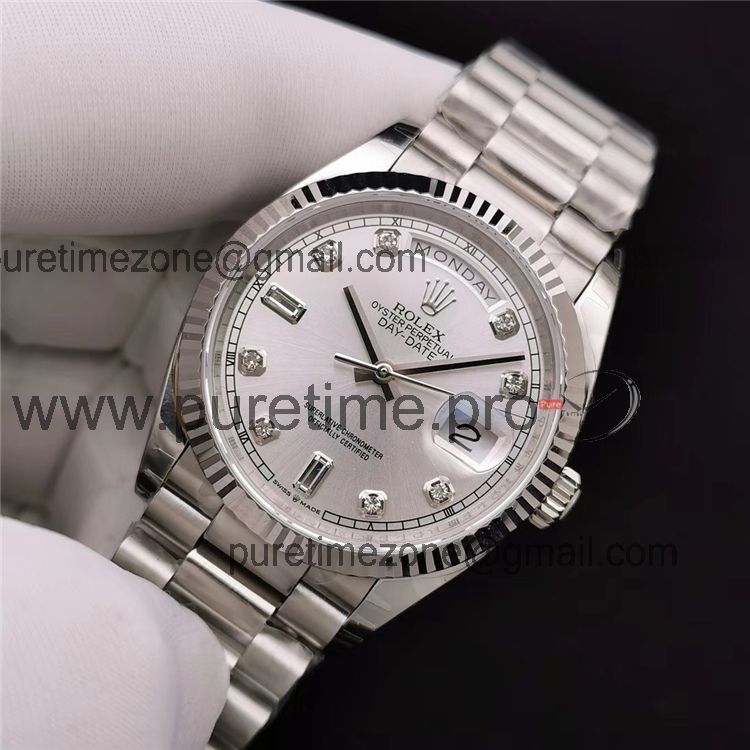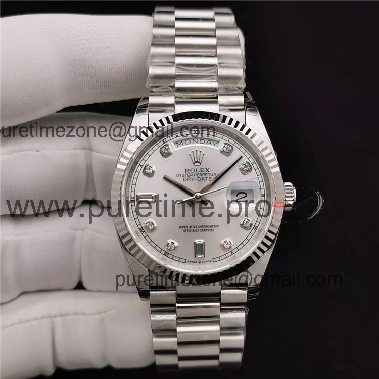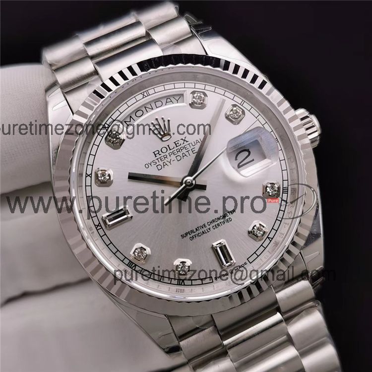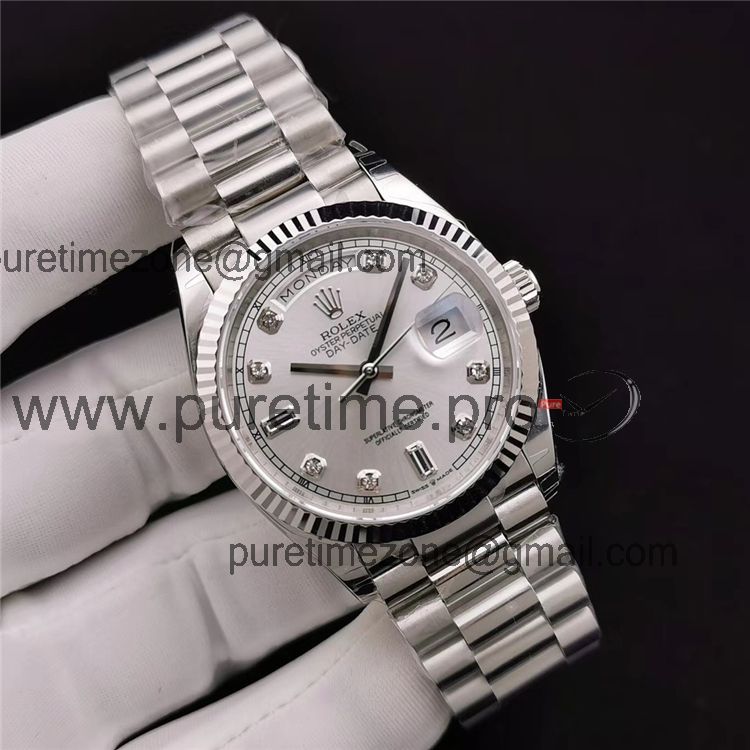 Home Rolex Day-Date EWF DayDate 36 128349 A2836 Automatic Mens Watch Fluted Bezel Silver Diamonds Dial President Bracelet Best Edition