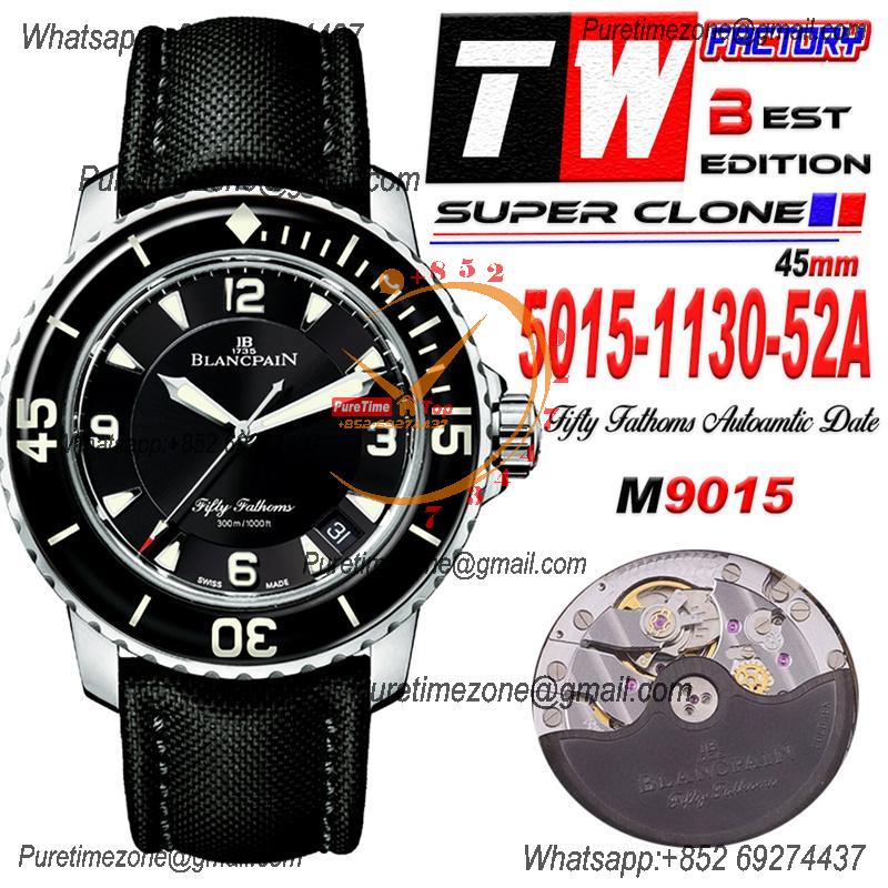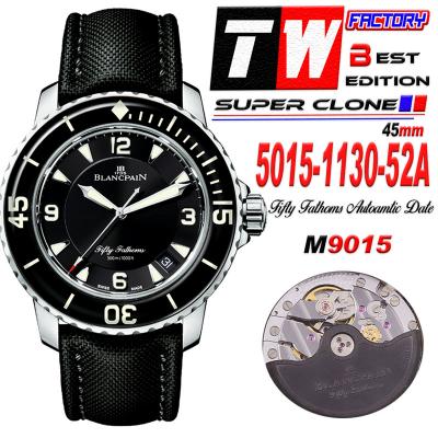 Fifty Fathoms 5015-1130-52A M9015 Automatic Mens Watch Best Edition TWF 45mm SS Black Dial Sail-Canvas Strap CHS