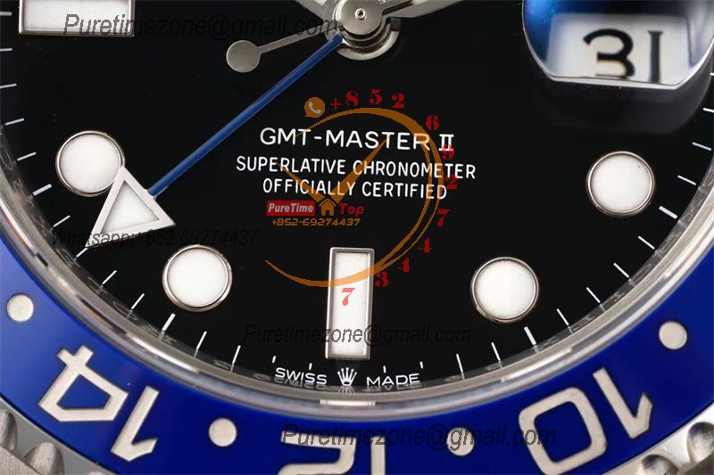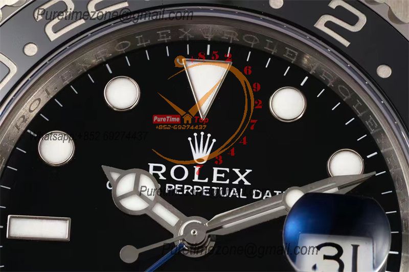 Movement:Asian Shanghai Super Clone 3285 Automatic GMT movement with decorated bridges & rotor with correct hand stack, All functions same to the Gen watch