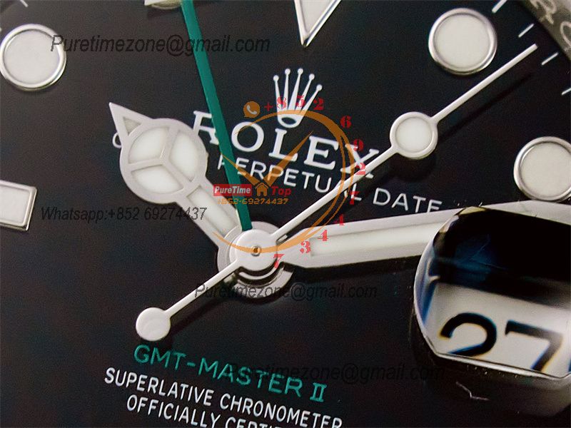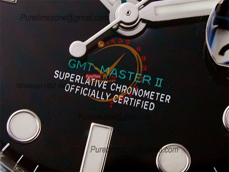 Movement:Asian Shanghai Super Clone 3285 Automatic GMT movement with decorated bridges & rotor with correct hand stack, All functions same to the Gen watch